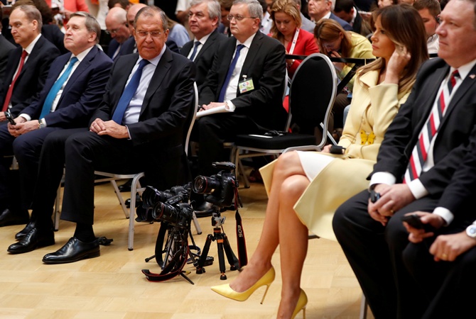 В кадр попал министр иностранных дел России Сергей Лавров, который смотрит на ноги супруги американского лидера Меланьи Трамп.