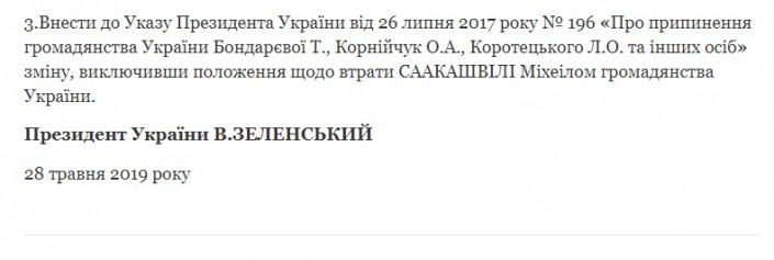 На сайте опубликован указ, исключающий положение об утрате Саакашвили гражданства Украины. Этим документом Зеленский отменил действие одного из положений указа, которое было подписано экс-президентом Петром Порошенко.